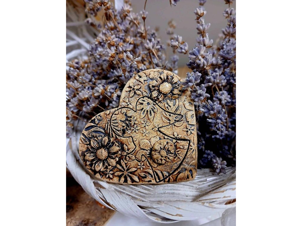 Na výrobu tohto keramického srdiečka som použila kvalitnú keramickú hlinu. Po dokonalom preschnutí sa vkladá výrobok do keramickej pece na prvý prežah. Následne sa na neho nanáša prírodné farbivo a glazúra. Po nanesení putuje výrobok opäť do pece na druhý výpal pri vysokej teplote.