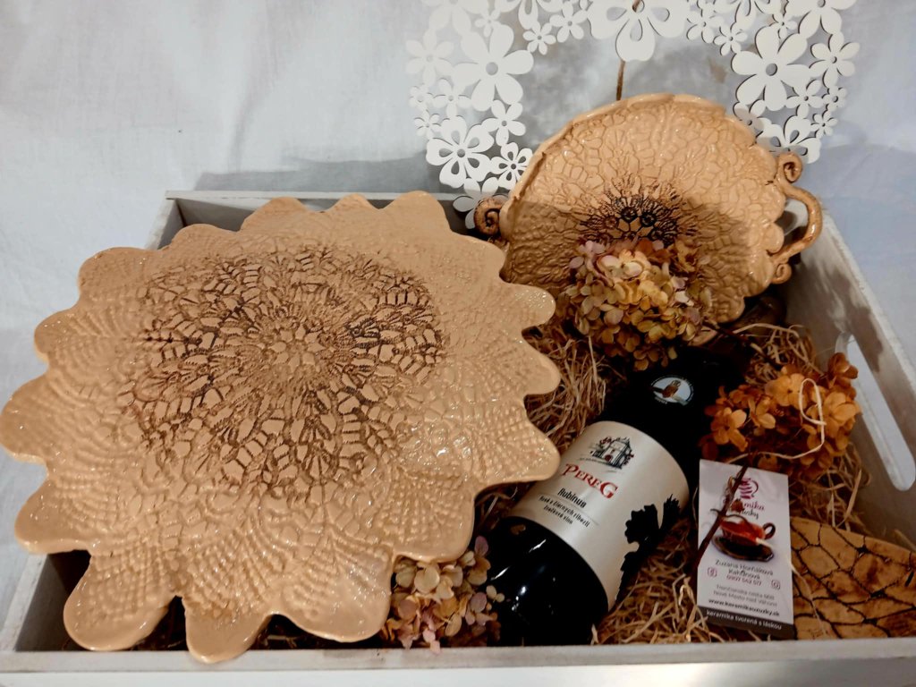 Krásna sada - pozostávajúca z keramického podnosu napríklad na zákusky a tanierika, ktorou očaríte nejednu návštevu. Nemala by chýbať na nejednej chalupe, zariadenej do štýlu vintage, rovnako tak krásne vynikne na prírodnom stole u Vás doma.