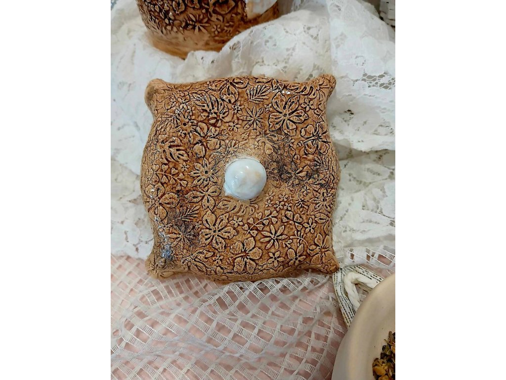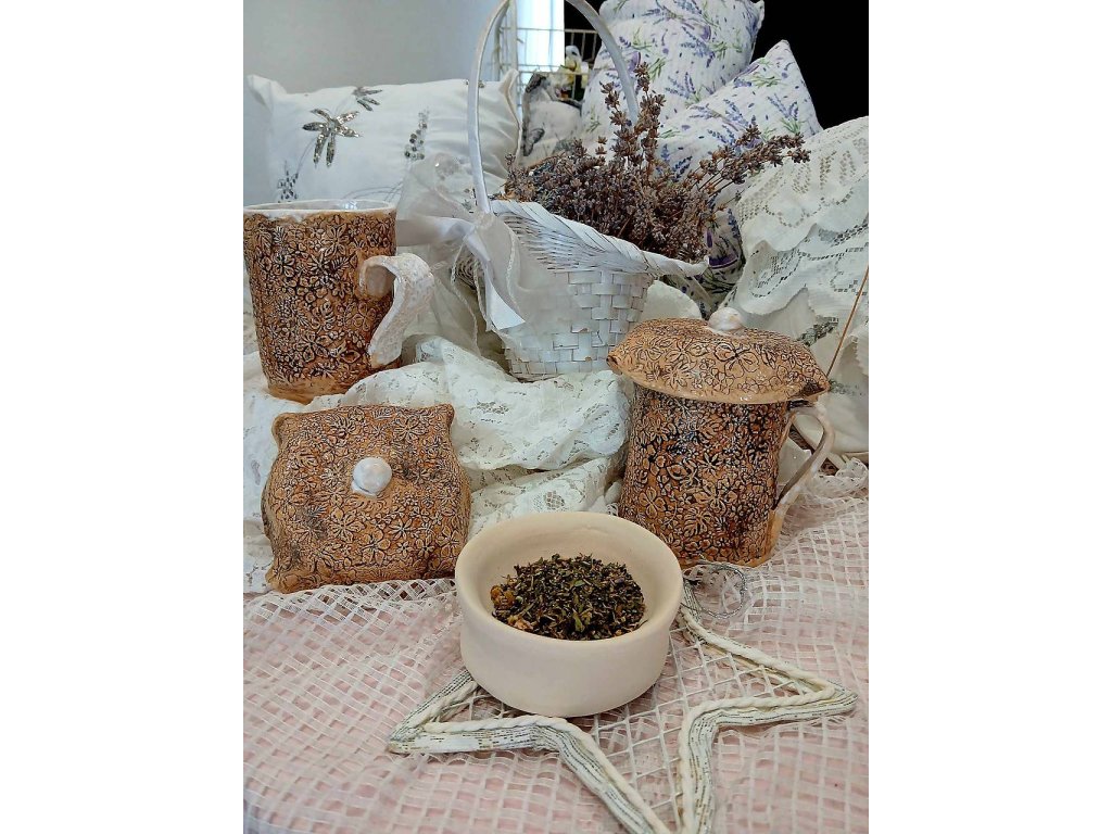 Na výrobu tohoto krásneho keramického výrobku som použila kvalitnú keramickú hlinu. Po dokonalom preschnutí sa vkladá výrobok do keramickej pece na prvý prežah. Následne sa na neho nanáša prírodné farbivo a glazúra. Po nanesení putuje výrobok opäť do pece na druhý výpal pri vysokej teplote.
