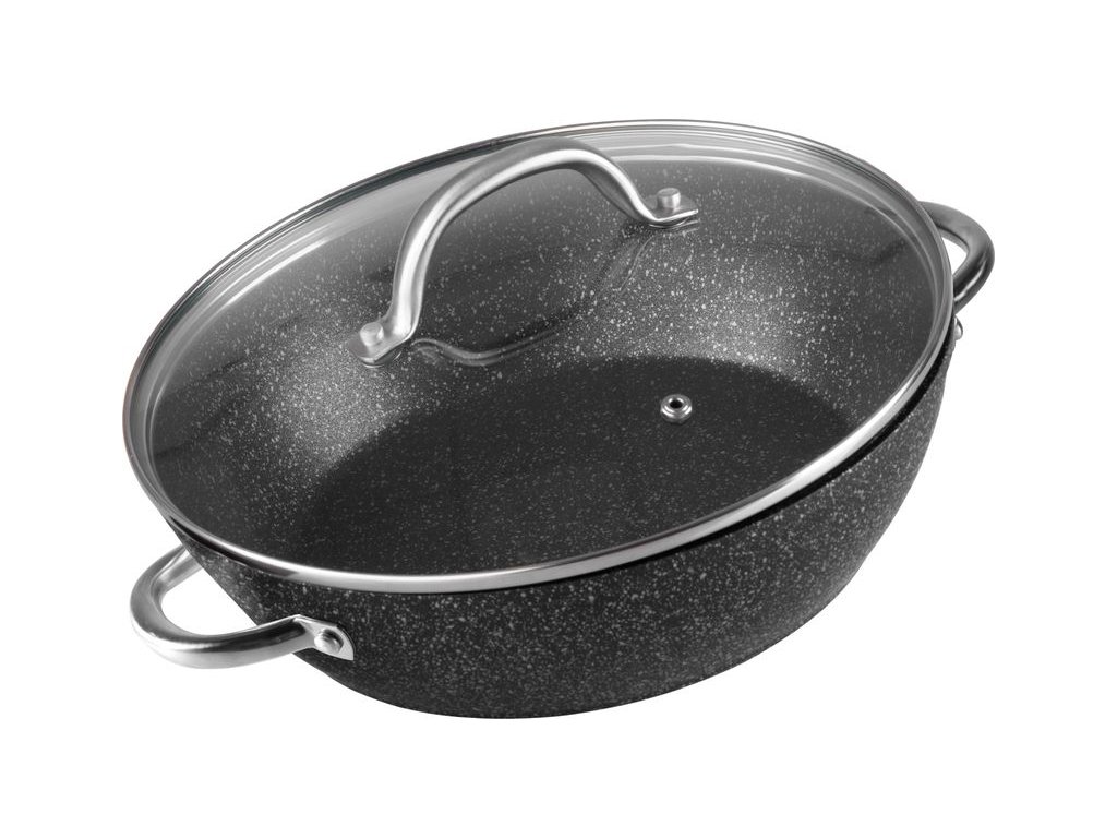 Ak si potrpíte na kvalitné kuchynské riady, tento hrniec je pre Vás ako stvorený. Plytký hrniec s pokrievkou MagicHome je vyrobený zo zliatiny hliníka s nepriľnavým povrchom a 3-vrstvovým mramorovým náterom. Má 3 mm indukčné dno, ktoré šetrí energiu. Rukoväť je celonerezová a umožňuje použitie v rúre na pečenie. Hrniec je vhodný na všetky typy sporákov : indukcia, elektrika, plyn, sklokeramika a halogén a je tiež vhodný do umývačky riadu. Je šetrný k životnému prostrediu, neobsahuje PFOA, PFOS, VOC, PB ani CD. Objem: 2,8 litrov.