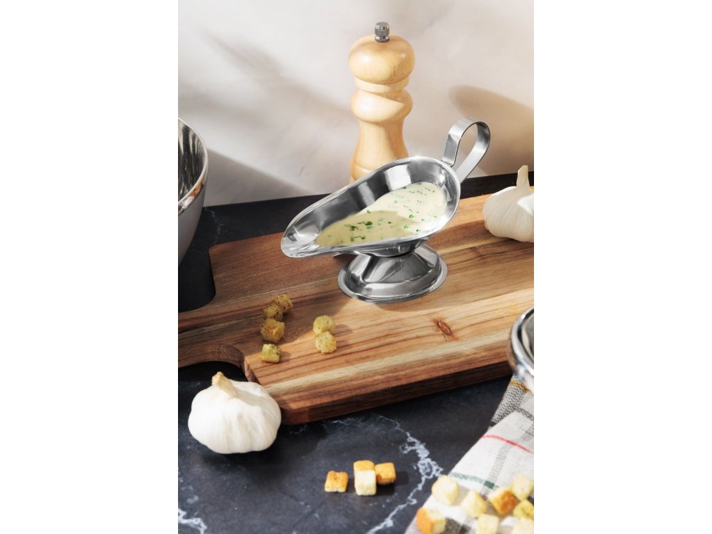 Doprajte si eleganciu pri každom stolovaní. Servírovací omáčnik MagicHome s objemom 150 ml je ideálny na podávanie omáčok, dipov či dresingov. Vyrobený z kvalitnej nehrdzavejúcej ocele, zaručuje odolnosť, dlhú životnosť a jednoduchú údržbu.
