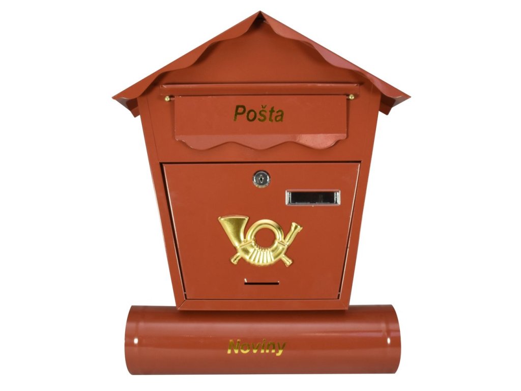 Elegantná poštová schránka v hnedej farbe. Obsahuje časť na letáky. Rozmery: 37x10x44 cm. Materiál: kov.